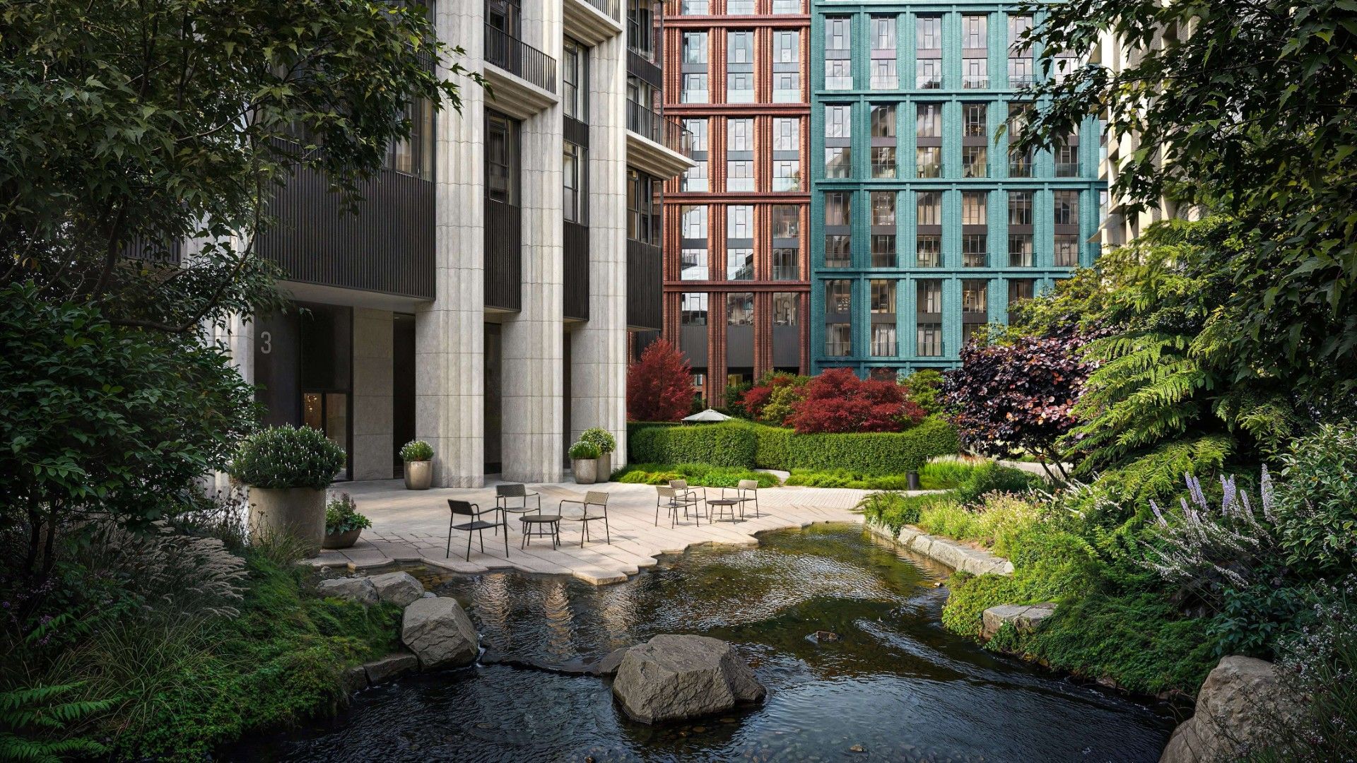 В парке созданы крытые галереи и приватные зелёные комнаты для тихого отдыха в любую погоду. Насыщенное озеленение многолетними растениями с разными периодами цветения сохраняет территорию квартала красивой круглый год.